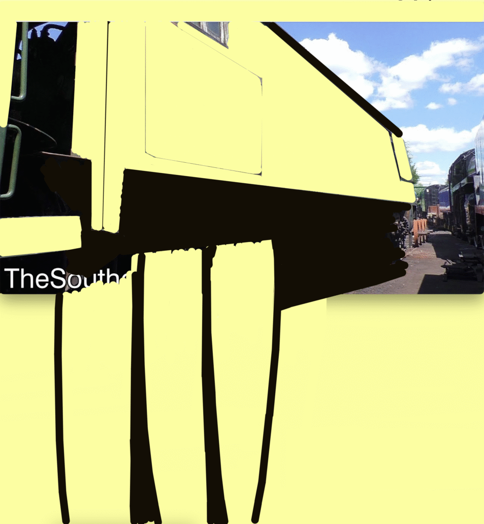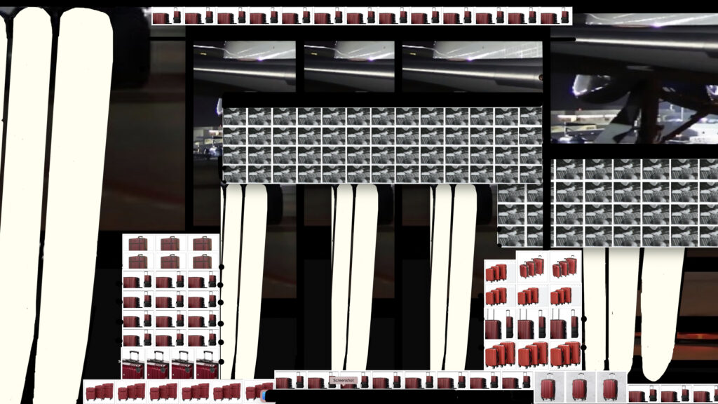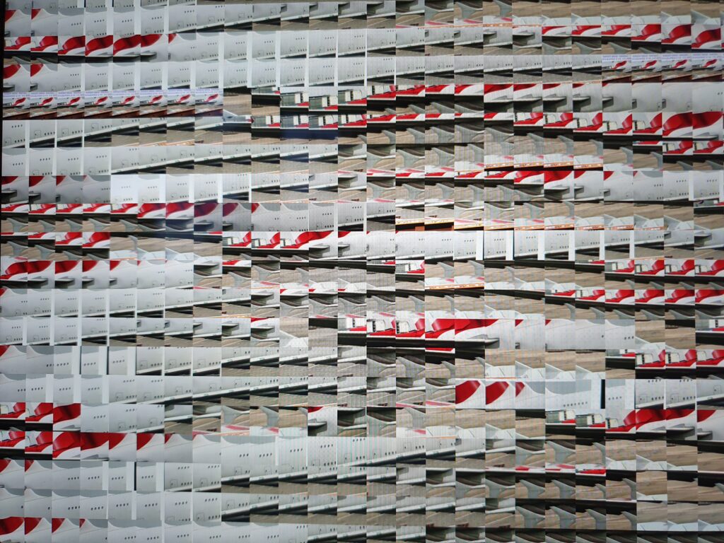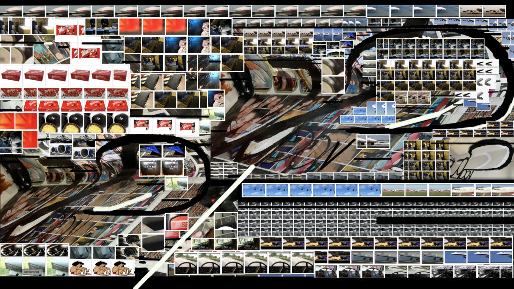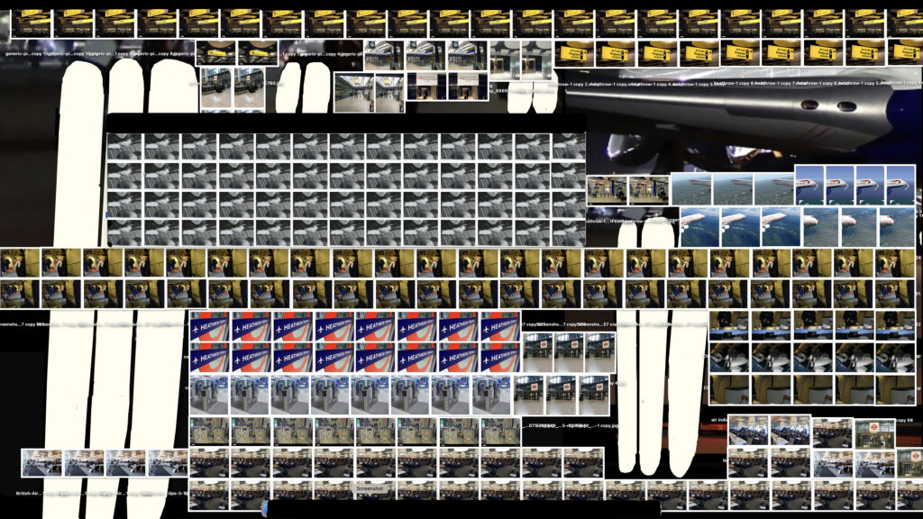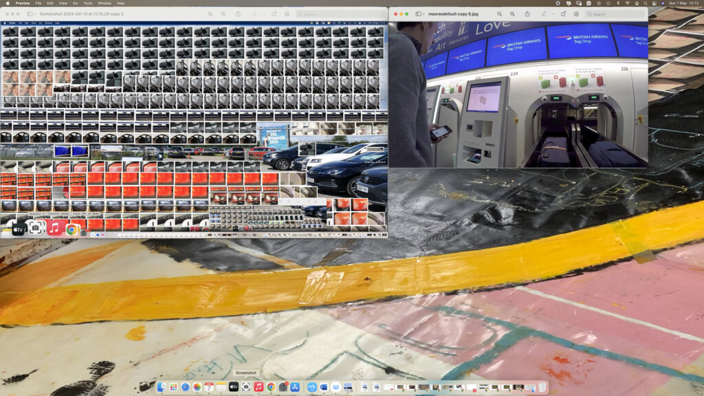 Gyan works on photographs using painting software on his computer. He starts with pictures from places he’s visited—airports from trips, scenes from Whipsnade Zoo, or photos of his own art room. Using the digital painting tools, he adds thumbnails over the original photograph, then incorporates lines and colors.