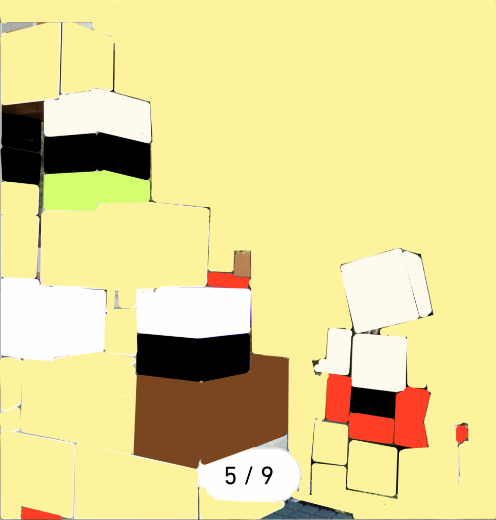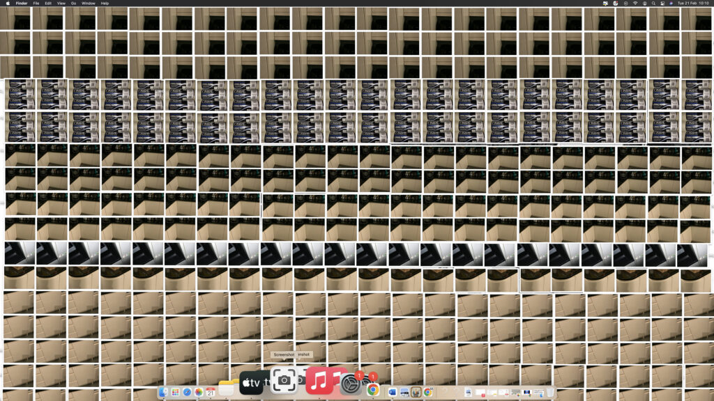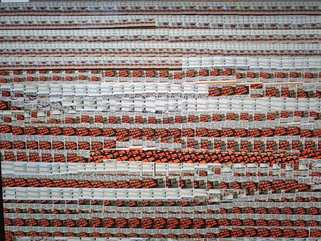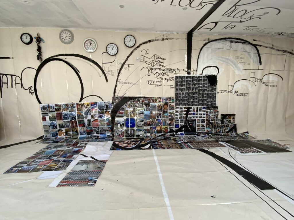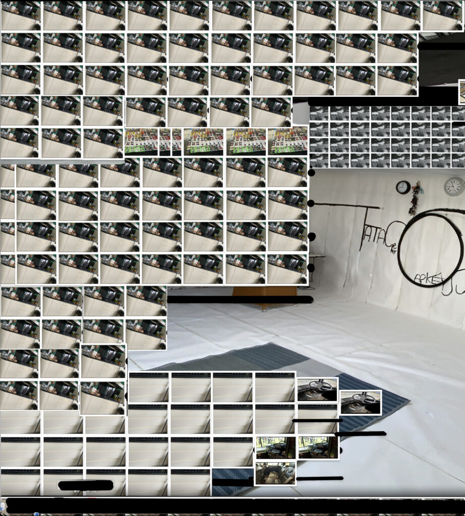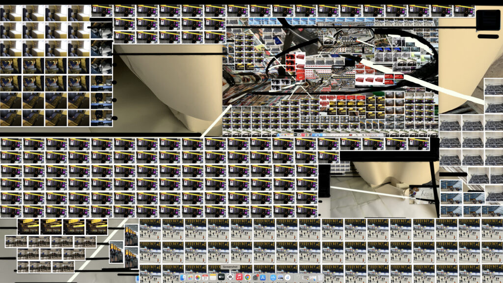 It begins with thumbnails arranged on the screen, where digital images of the art room blend with repeating thumbnail patterns. But the creative process flows in both directions—the physical space around the screen starts to mirror the digital composition, with printed pictures covering the walls in wallpaper-like patterns. The boundary between screen and room gradually dissolves, creating a continuous visual experience where digital and physical art merge into one unified space.