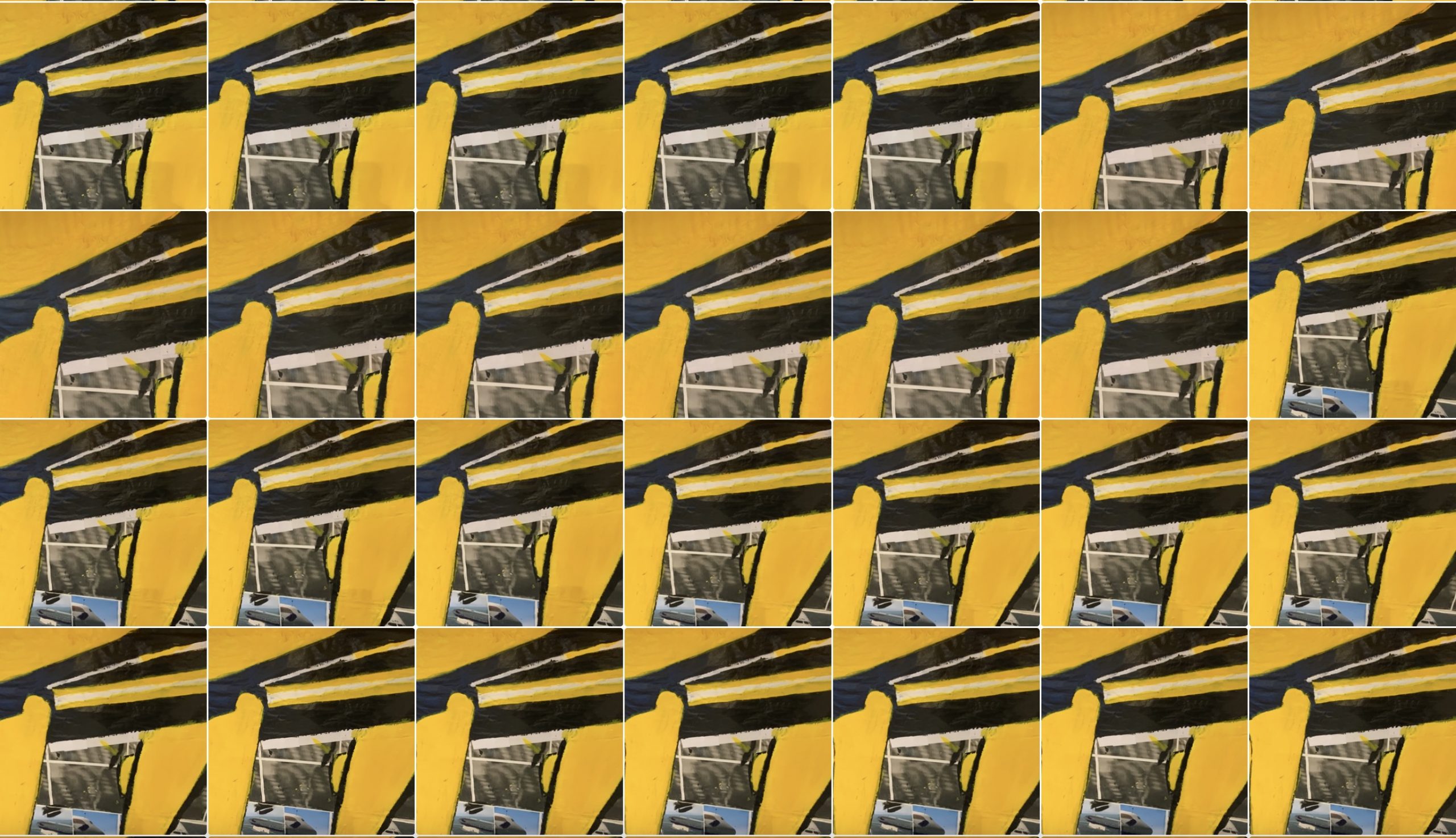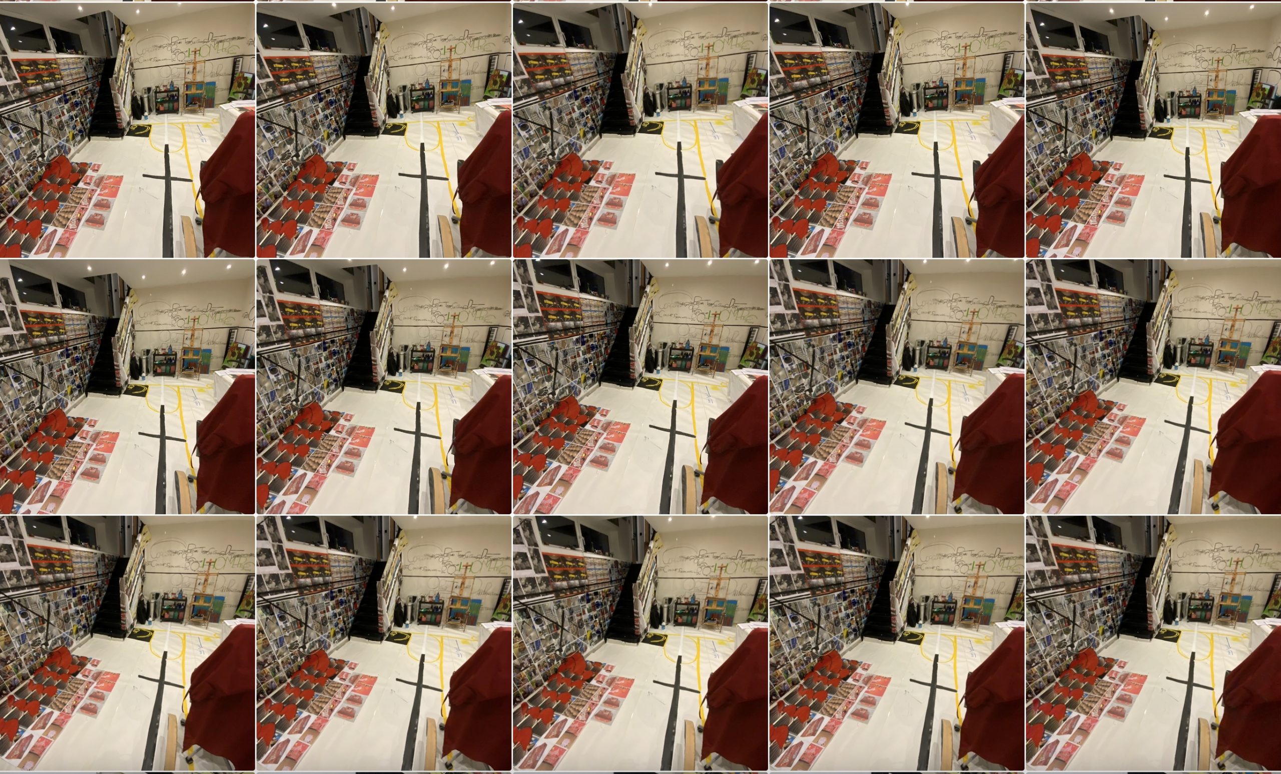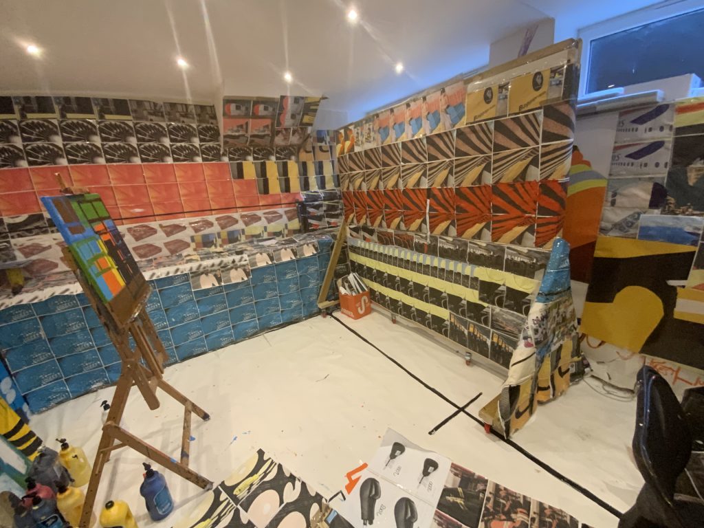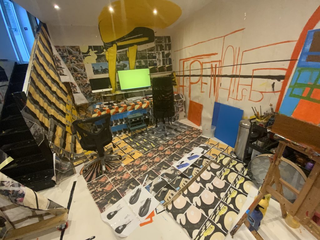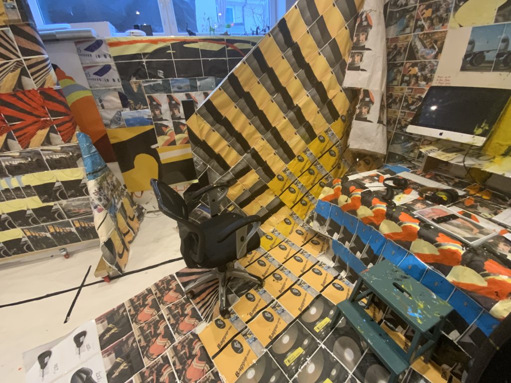 Patchwork: Gyan fills his space with collages of prints and paintings, often featuring repeated motifs. He then photographs this space—actually taking dozens of pictures of the same frame. The result: his art room becomes a subject itself, transformed into pictures that appear as patchwork compositions.