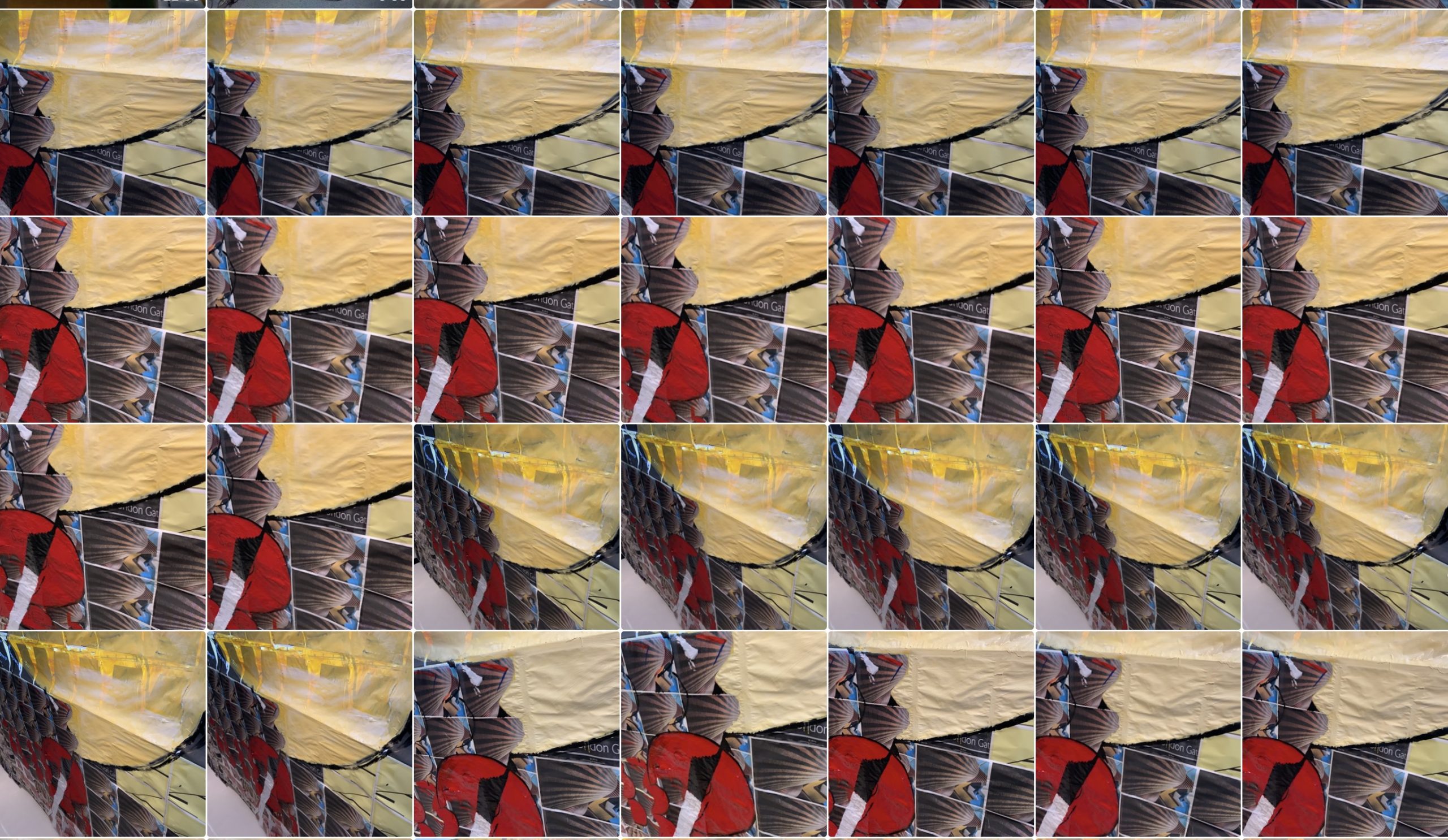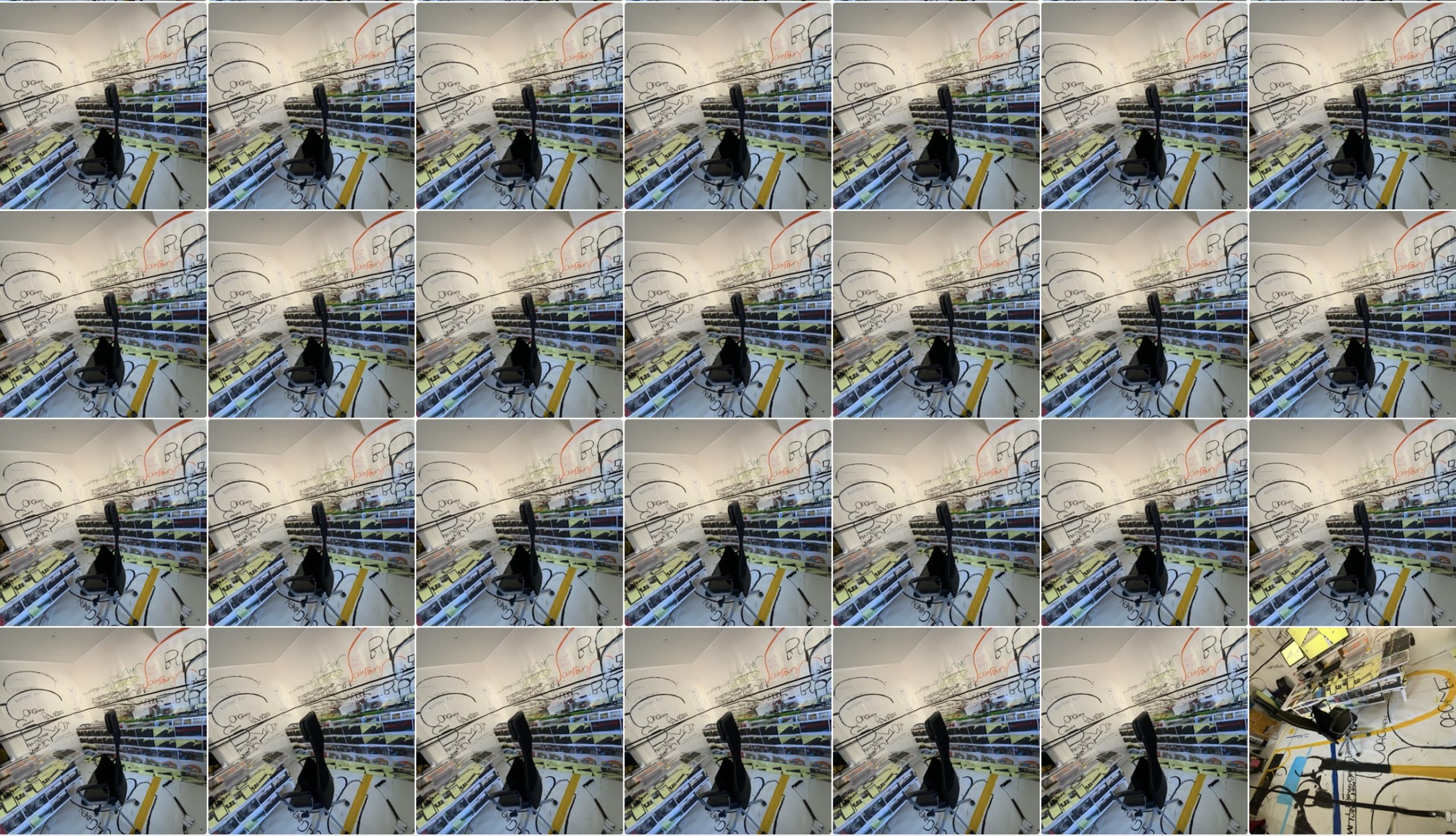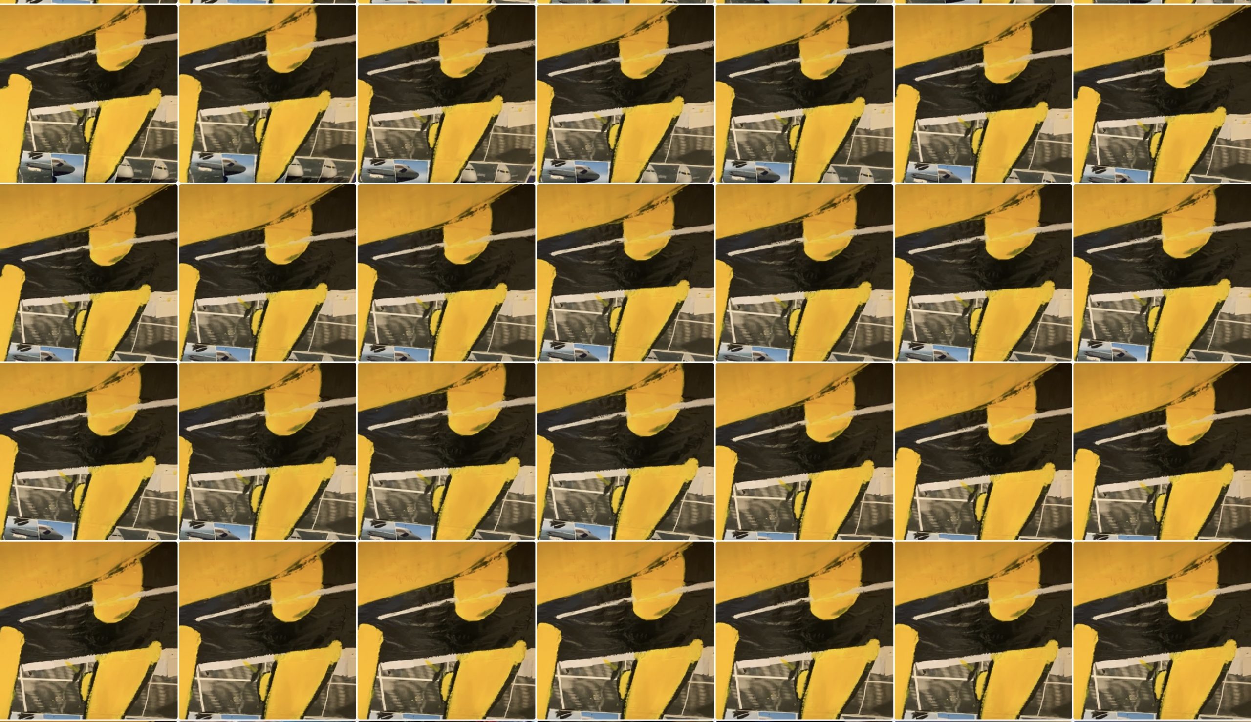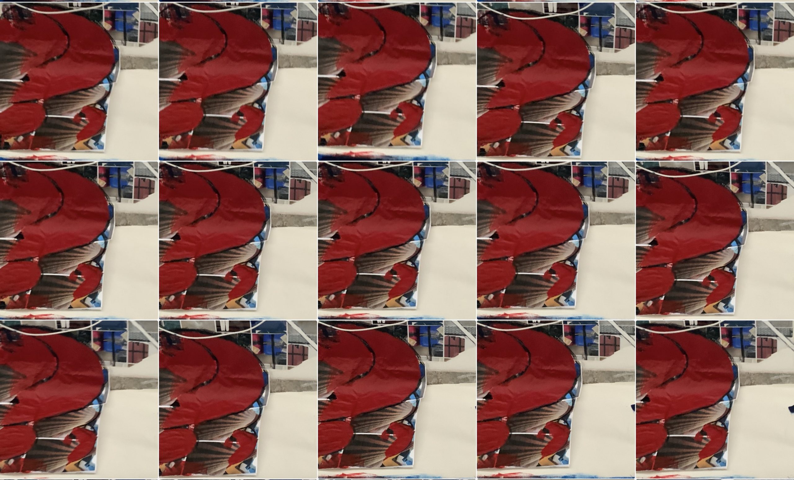 Patchwork: Gyan fills his space with collages of prints and paintings, often featuring repeated motifs. He then photographs this space—actually taking dozens of pictures of the same frame. The result: his art room becomes a subject itself, transformed into pictures that appear as patchwork compositions.